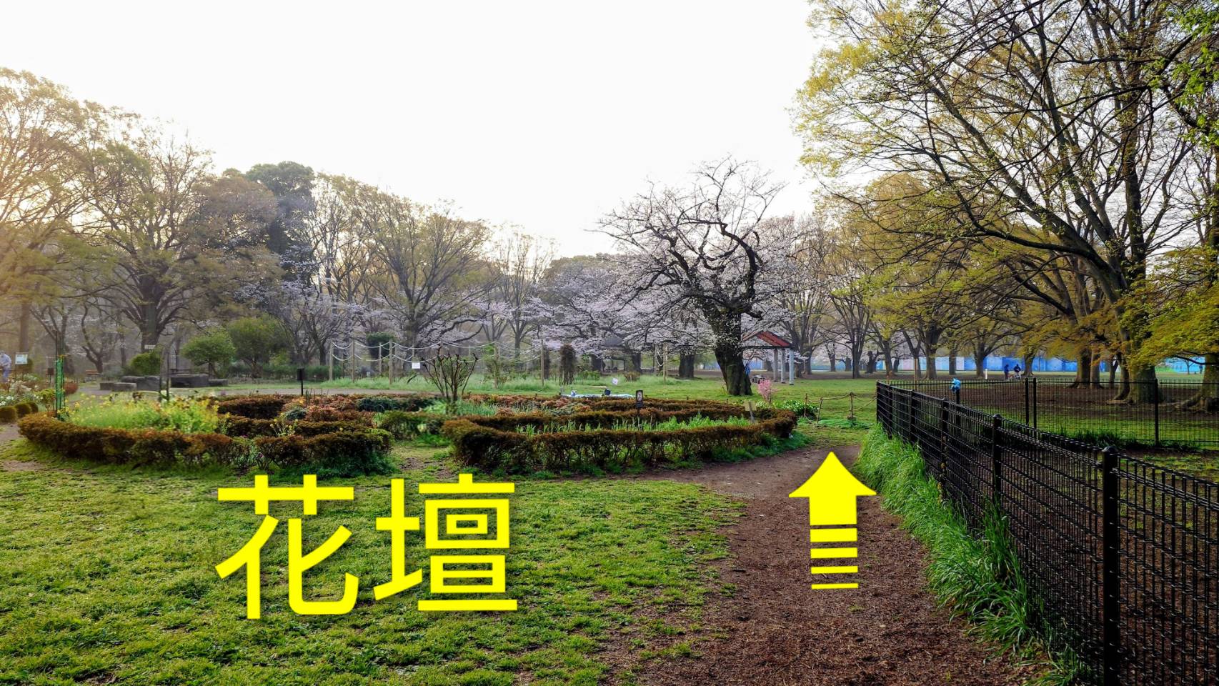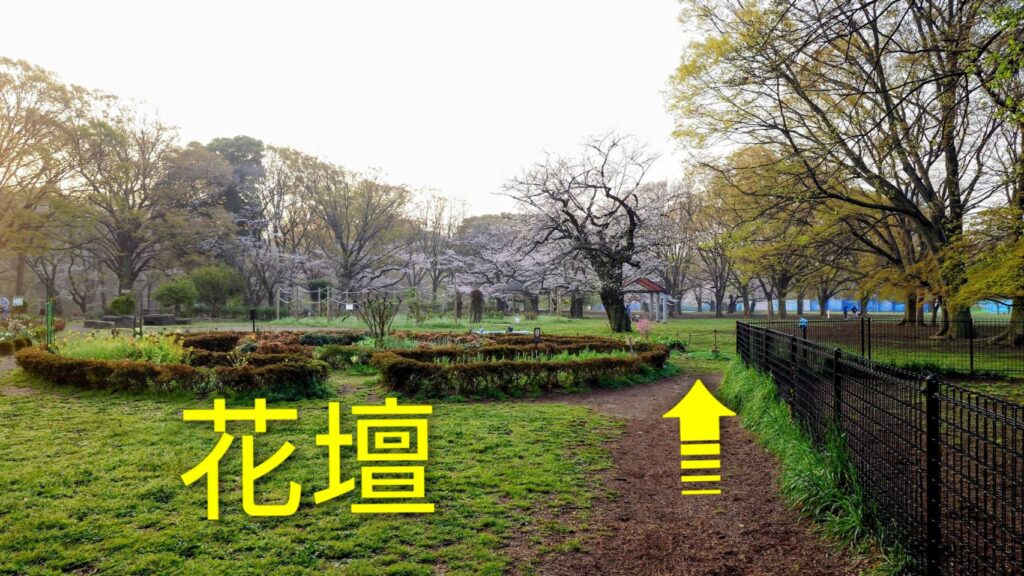 (4)芝生を奥まで突っ切り、 花壇(フラワーランド)とドッグランの間にある桜の木の中の、